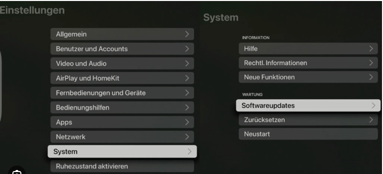 Auf Apple TV: Gehen Sie zu Einstellungen > System > Software-Updates und wählen Sie „Update suchen“. Falls verfügbar, installieren.