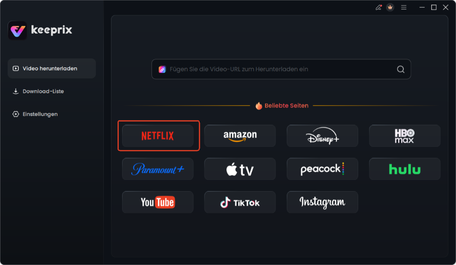 1. Software installieren und starten: Laden Sie den Keeprix Downloader von der offiziellen Webseite herunter, installieren Sie das Programm und öffnen Sie es. Wählen Sie im Hauptmenü „Netflix“ aus.