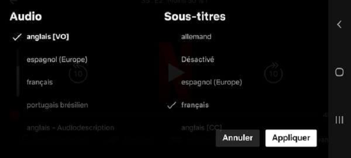 Les démarches sont comparables à celles effectuées sur un ordinateur : Appuyez sur l’icône de discussion située en bas de l’écran. Sélectionnez la langue de l’audio et des sous-titres que vous désirez.