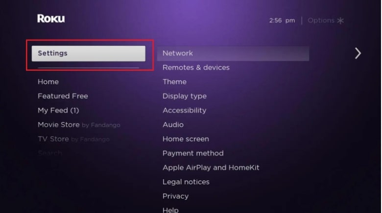 Step1.Rokuリモコンのホームボタンを押し、上矢印を1回押して設定オプションを選びます。その後、右矢印で全設定を表示します。