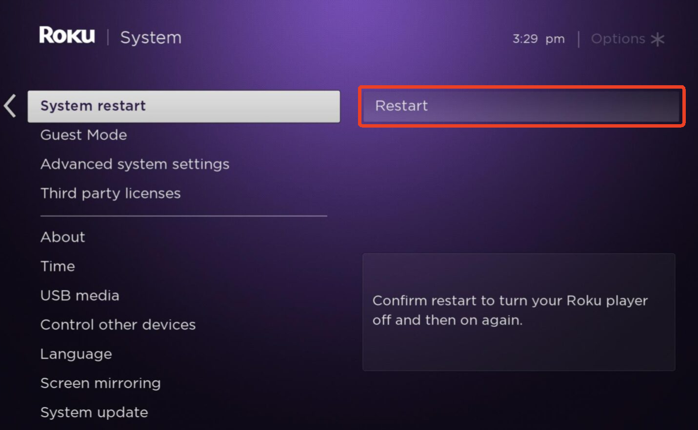 Step3.「再起動」を選び、もう一度確認してRokuを再起動します。