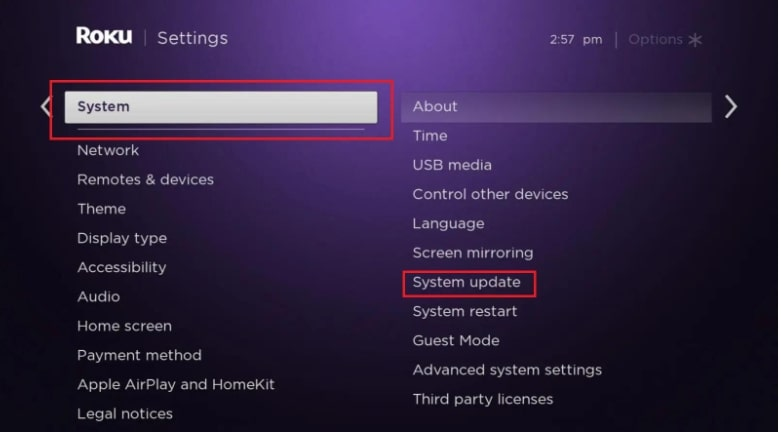 Step1.Rokuの設定に入り、「システム」タブを選択します。