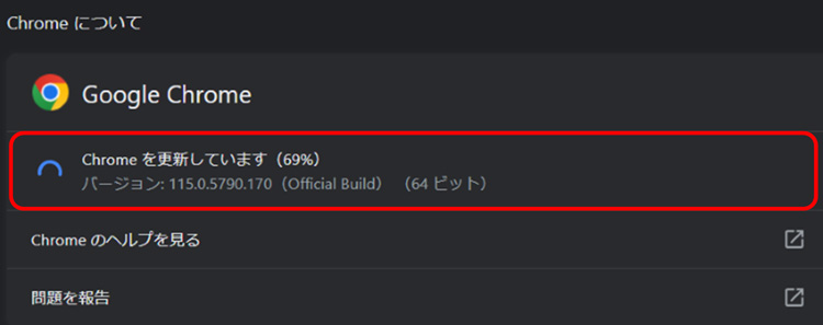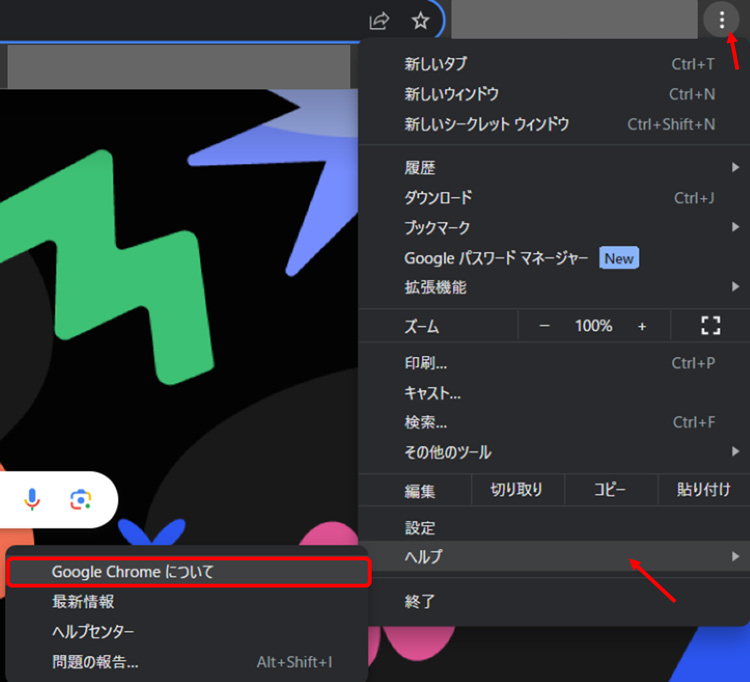 Step1. Chrome右上の三点アイコンを押し、「ヘルプ」→「Google Chromeについて」を選択します。