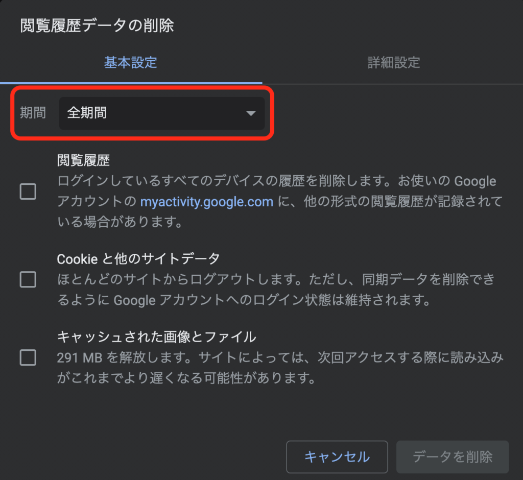 Step2.Cookieとキャッシュにチェックを入れ、「データを削除」を押します。
